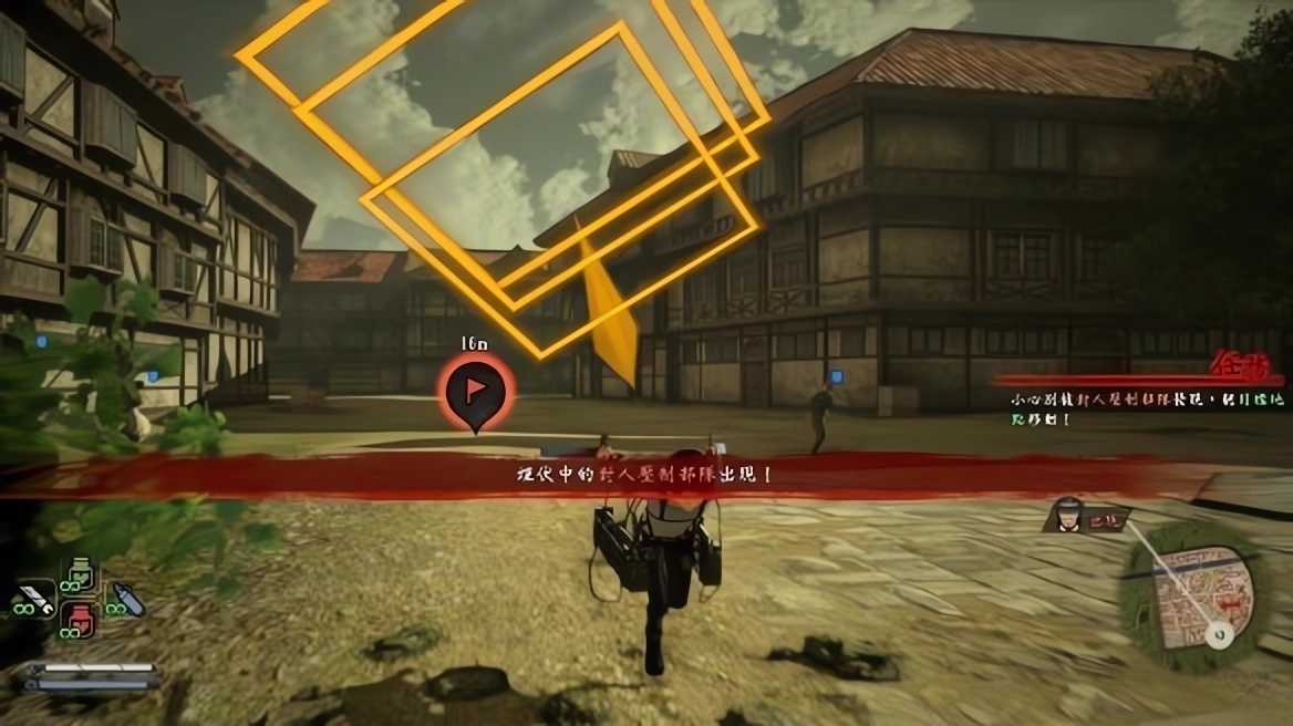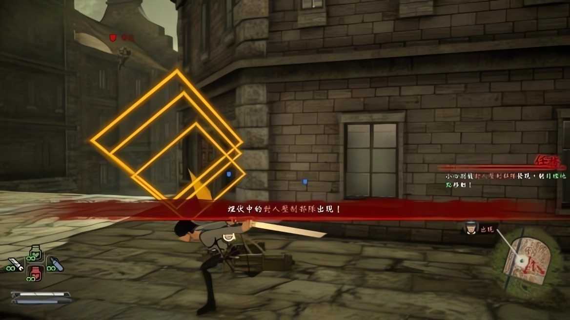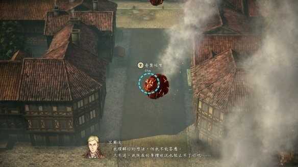 6、被炸碎的巨人碎块飞向了城内,此时需要控制利威尔切削肉块,操作方法和使用望远镜突袭巨人一样,此时镜头会直接进入瞄准界面,操纵方向键瞄准肉块进行斩击。肉块实在太多只需要斩击其中几块即可。