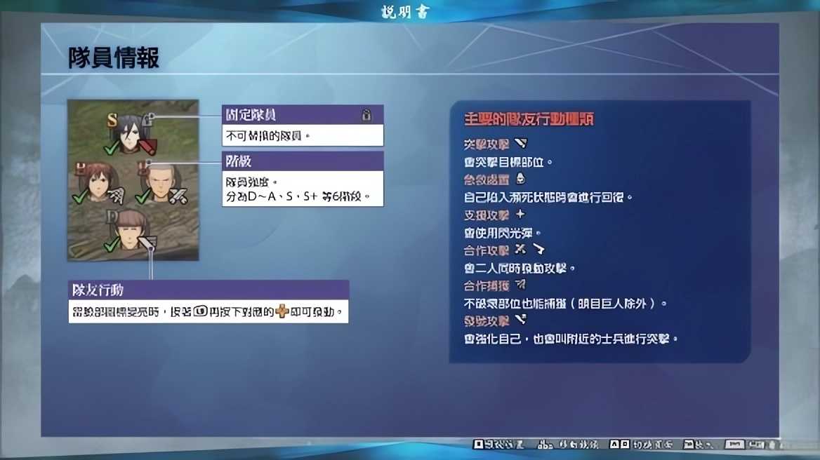 前作进击的巨人中也广受好评的动作系统再进化。使用按键与操作杆的组合,拥有在空中自由奔驰的爽快感,新作中实装从巨人背后瞄准的动作,玩家可以体验到自由度更高的多样立体机动装置。